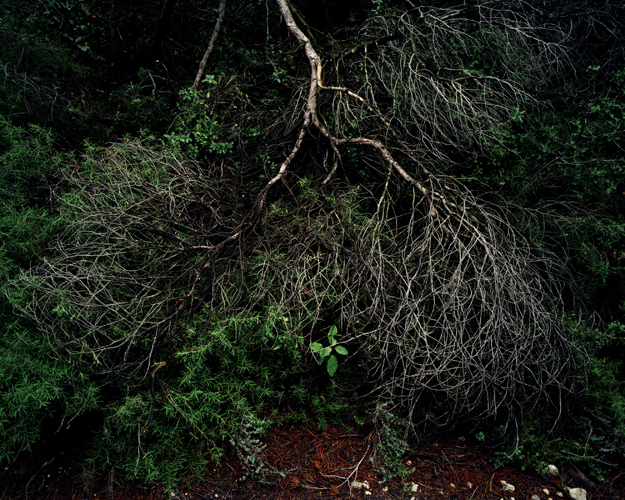 Cette série associe des vues en plongée et resserrées sur des fragments naturels et des vues plus larges, mais toujours fermées où le corps humain apparaît. Ce corps s’insère dans la nature, il est recouvert, dominé mais aussi recueilli par elle. L’homme redevient cette « mince bête blanche », chassé du Paradis, de la nature originelle, à la fois en dissonance et en intimité.